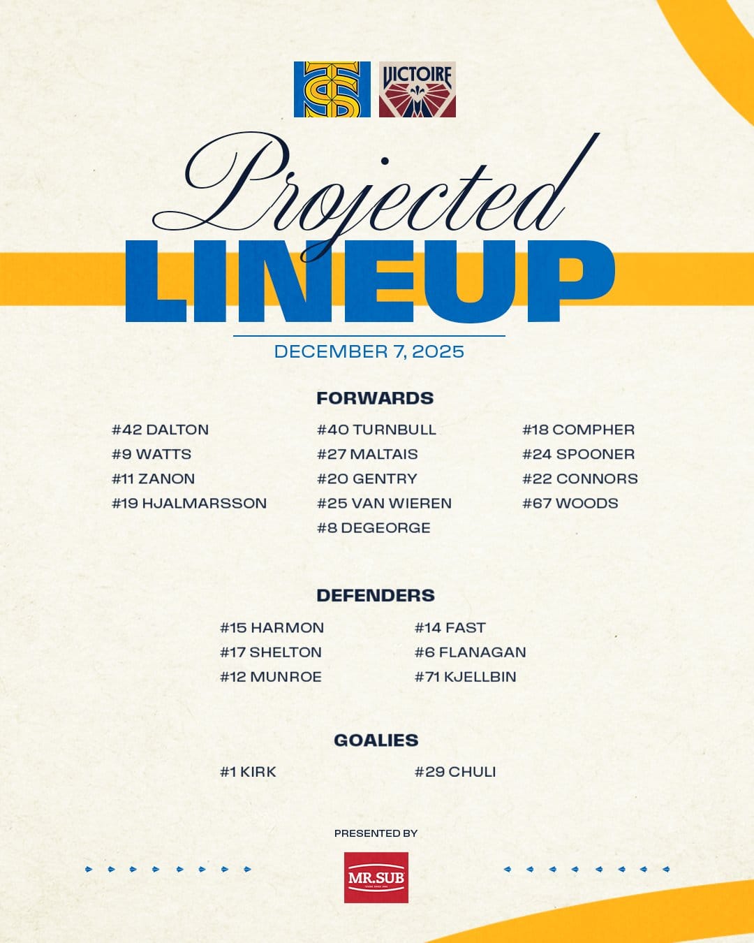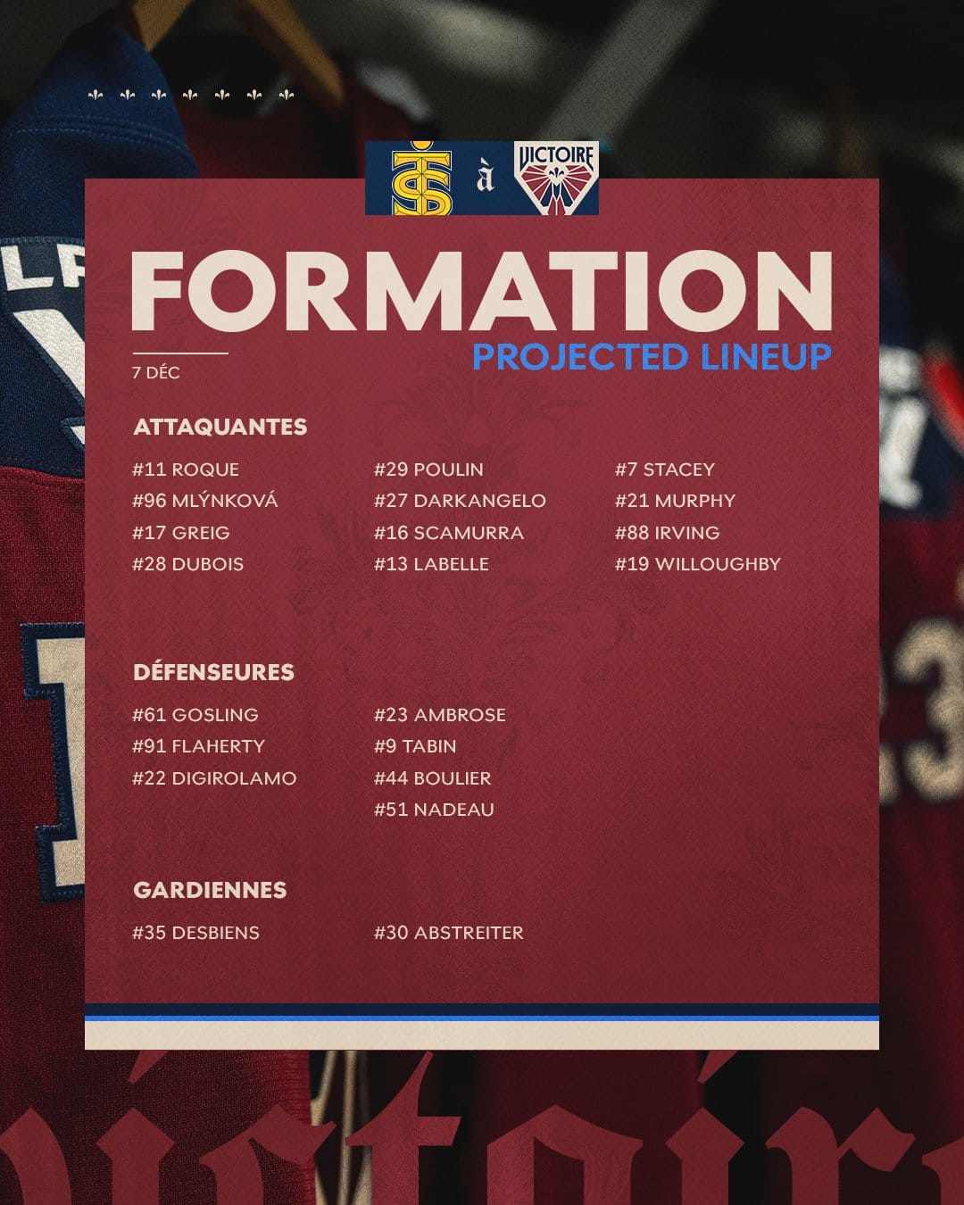 As you know, their second goalie Elaine Chuli is now Toronto's tandem partner with Raygan Kirk. Coming into the Victoire is Sandra Abstreiter from Ottawa, and rookie Megan Warrener. Forwards Claire Dalton and Clair DeGeorge also moved to the Sceptres.