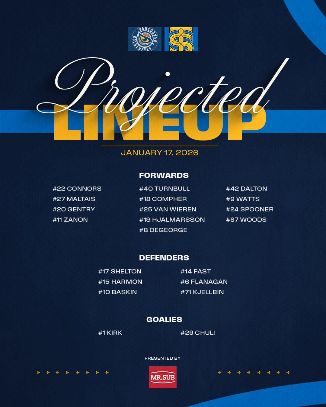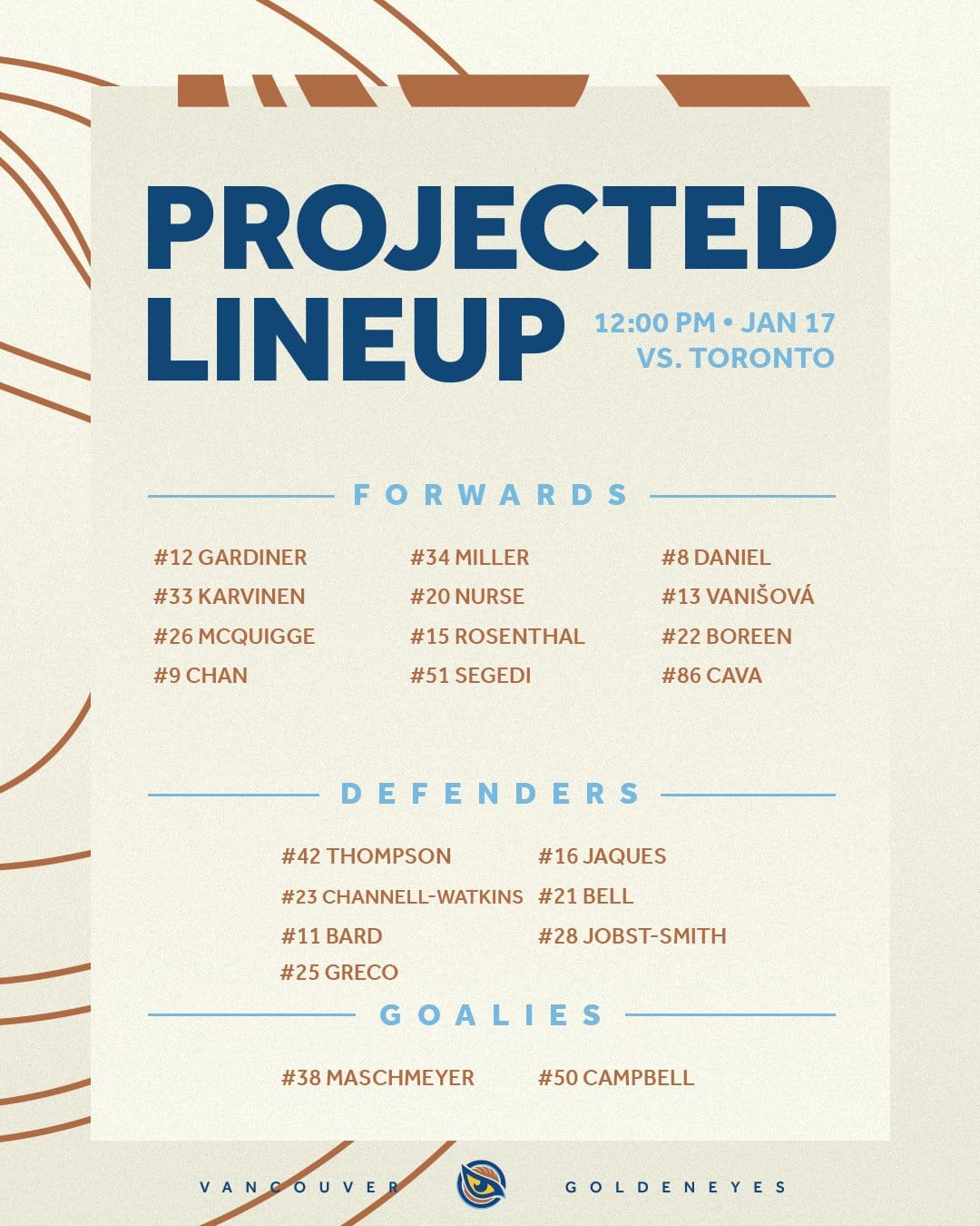 The Goldeneyes last game was on January 11 in Montréal where they lost 1-0 in regulation. Vancouver has a Points % of 0.333 and are in last place.