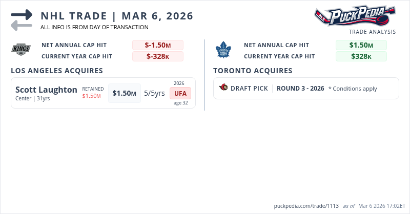 Laughton, who turns 32 this spring, was acquired by the Leafs last year at the deadline in a trade that many people have said (more than once) that it was a bad deal. He was dealt from the Flyers for prospect Nikita Grebenkin and Toronto's 2027 first round pick. The Flyers retained half of his salary, making his cap hit for this season, $1.5 million. He is a UFA this summer.