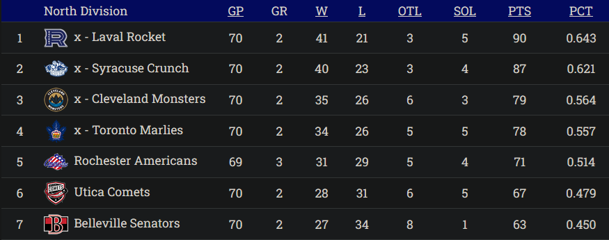 The Marlies really want to win these games out to have the chance to jump up to third place in the division and not have to face either the Amerks or Comets (mathematically unlikely, but still possible the Comets could do this with three straight regulation wins) in the play-in round, and instead skip that and go straight to facing the Syracuse Crunch in the playoffs, and also getting a few extra days off in that scenario. The Marlies are only one point back of the Monsters with both teams having only two games remaining. Here are the current North Division Standings.