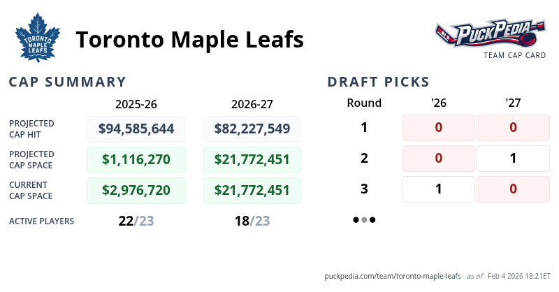 And to help you all in navigating the Leafs choices, their cap space: