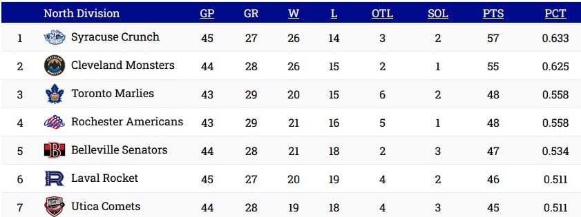 Here's how the North Division stands at the end of Sunday with the Marlies tied with the Amerks for third place.