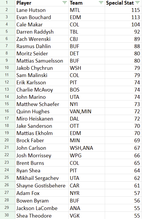 As for this award. I apologize to all, but if I had a vote for this award as constructed, I'd vote for Lane Hutson (not because of my stat, though). If you wanted me to vote for the best defender, though, I'd annoy you by asking: best at what?