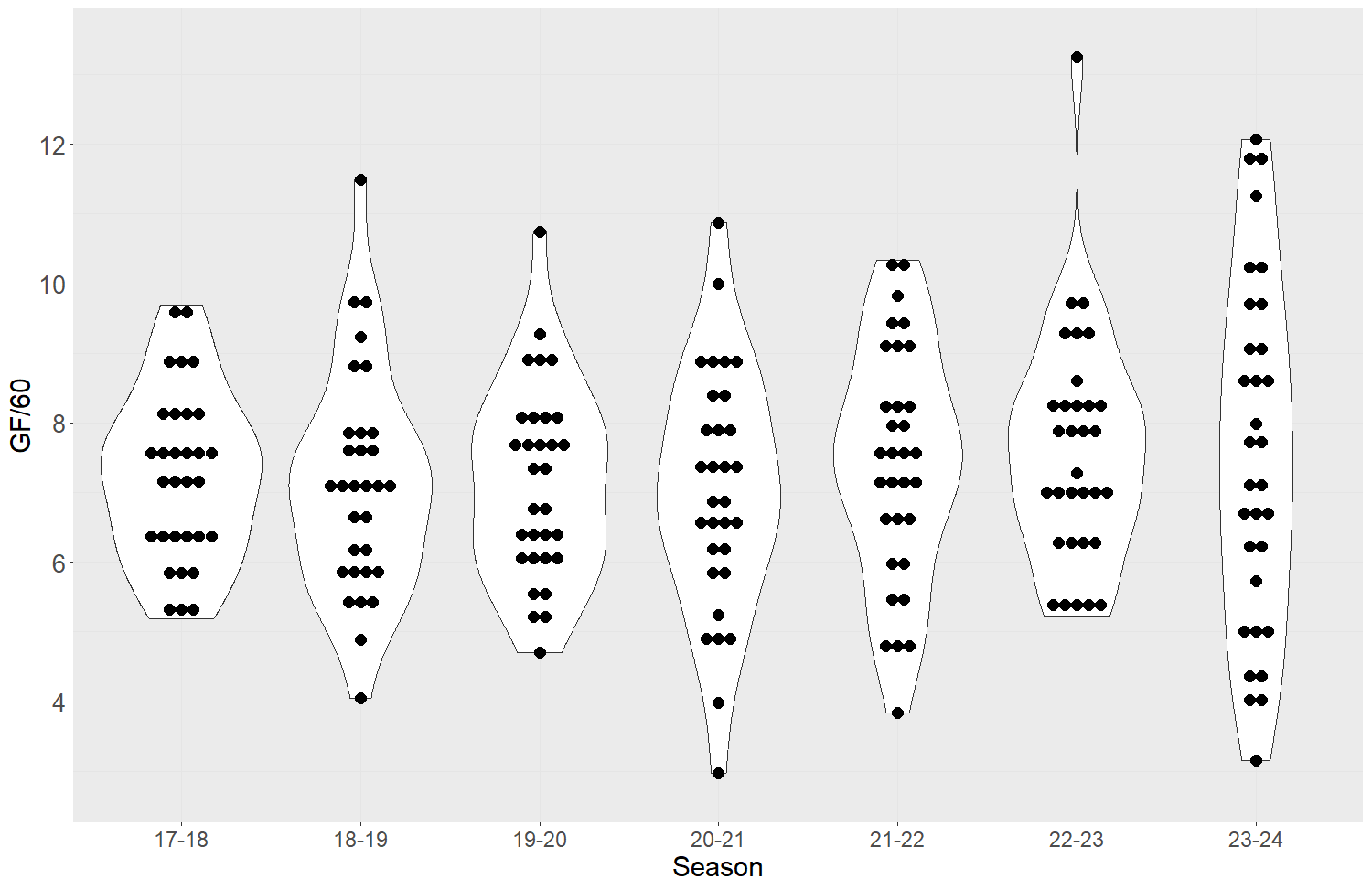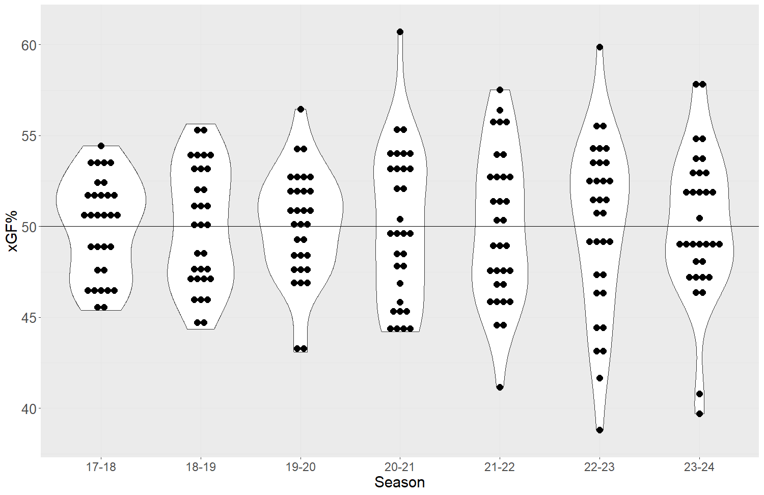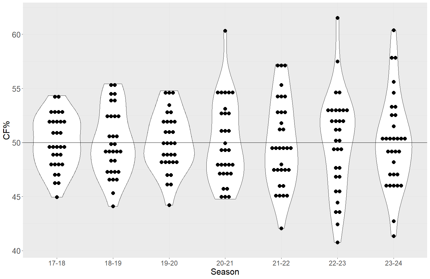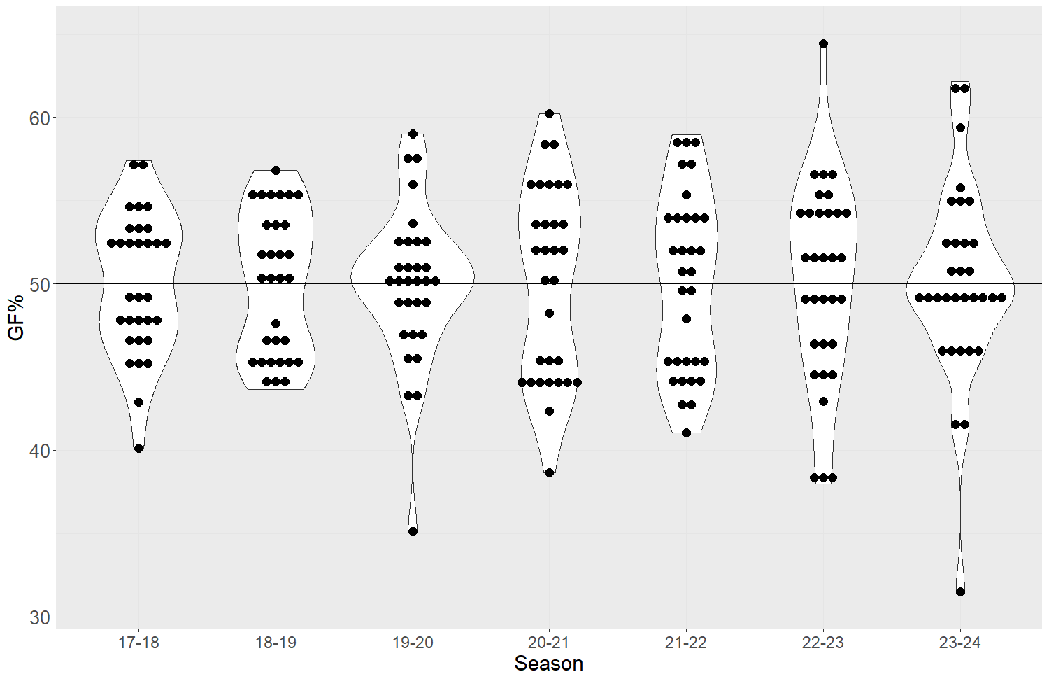 The Leafs are at 49% this season, one of the 11 teams on either side of the 50% line. If you go back to the earlier years, you see a tighter grouping of results, but fewer teams hanging right around the middle. This season is odd in that the muddy middle is staying really muddy well into the season, and very few teams have risen to the top.