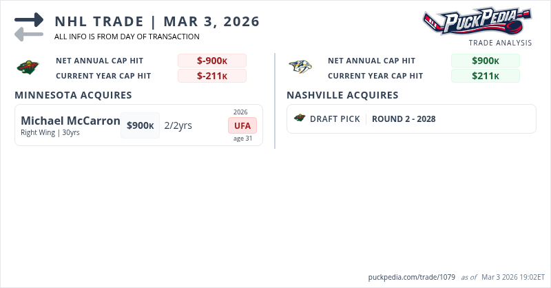 Cole Smith played three seconds of the Predators game against the Blue Jackets before being removed. The trade news was apparently broken by Columbus announcer Jody Shelley who overheard Smith tell a teammate he had been traded.