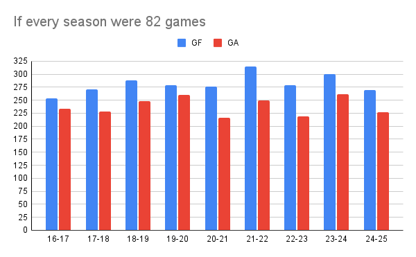 I looked at this two ways, first for people who think about goals in a season in whole numbers, this is the Matthews era, as if every season had 82 games in it: