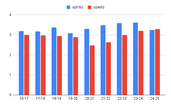 This shouldn't be news to anyone that the Leafs categorically did not limit chances against last year as well as they had the year before. They did not limit shots. They didn't allow a whole lot more than the prior year, in what had been an upward creep since long before Treliving or Berube joined the team. They coped with it and made it work with goaltending. They made the goals for as good as they were with the power play by a not insignificant amount.