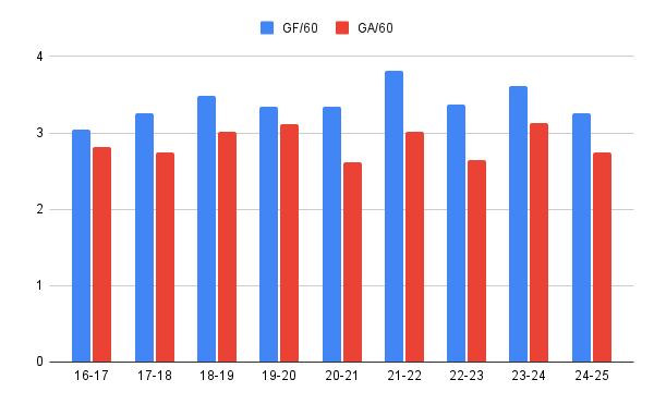 By results, last season was most like 2017-2018, a year everyone remembers fondly as more fun. The difference between last season and 23-24 is marked, and also marked by Matthews' goal glut one year and drought (by his standards) the next. And yet, that's a result that wins division titles.