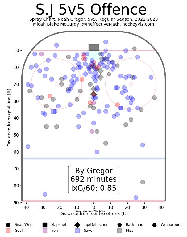 The next season he repeated the trick with junior sensation and former Barracuda teammate Jayden Halbgewachs. You have no idea how glad I am the Hurricanes have him on the tryout and we have Gregor. Gregor's transition to pro hockey has come slowly, and without a lot of AHL offence, but he's been played in the NHL a little every year because the Sharks needed a guy who could actually play a basic game at that level. Last year, he busted out with 10 goals in 57 games, and that chart above says it's not just luck.